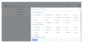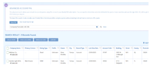 In the Search Bar, press Space. This will bring up some suggested fields that can be found in your leads or accounts. Select any of the fields which you require or type your selected field, then press space again. You can select the option to Equal or be similar to the result. For the last part, enter your desired search result in quotation marks, for example (CompanyPostcode LIKE “BA”) will return any record where the postcode contains “BA”.